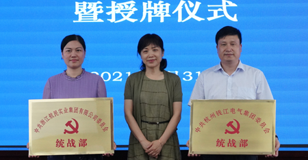 區(qū)委統(tǒng)戰(zhàn)部常務(wù)副部長(zhǎng)、區(qū)僑辦主任沈文珍為錢江電氣集團(tuán)和航民集團(tuán)兩家企業(yè)統(tǒng)戰(zhàn)部授牌。
